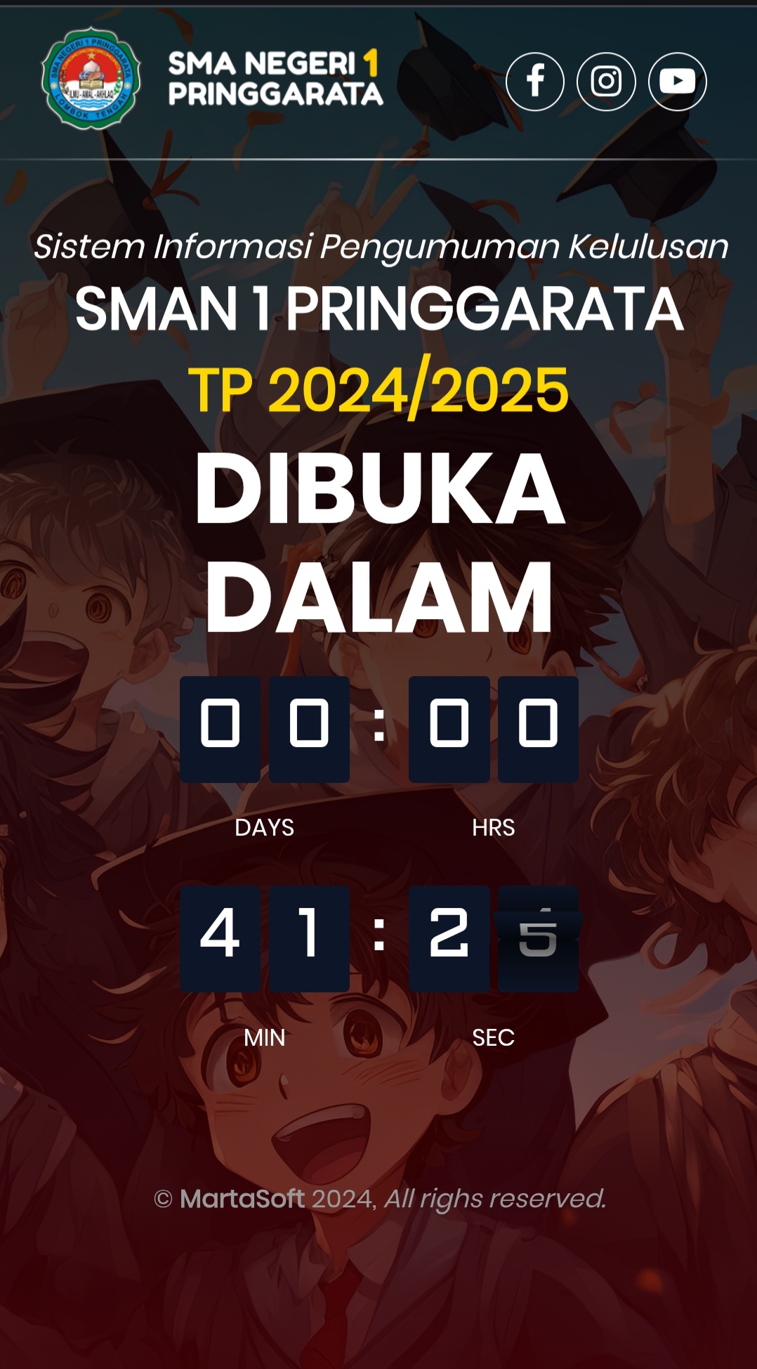 SMAPTA-Pengumuman kelulusan SMA/SMAK Provinsi Nusa Tenggara Barat dilaksanakan secara serentak pada Hari Senin, 5/5/2025 sesuai dengan ketentuan Dikbud NTB pada surat Nomor: 420/1979.UM/Dikbud bahwa pengumuman dapat dilakukan secara online atau offline mulai pukul 16.00 WITA sampai paling lambat 23.00 WITA. Pengumuman kelulusan SMAN 1 Pringgarata dilaksanakan melalui online yang dapat diakses melalui link https://sman1pringgarata.sch.id/sipengulu/ dengan login menggunakan NIS (Nomor Induk Siswa) yang akan dibuka pukul 20.30 WITA. Informasi lainnya dapat langsung menghubungi admin sekolah.