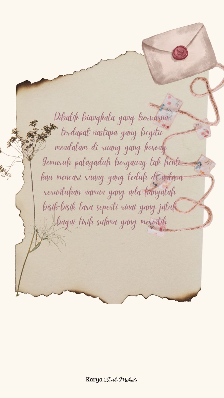 “Dibalik pelangi yang berwarna terdapat kesedihan yang megitu mendalam di ruang yang kosong gemuruh kegelisahan bergaung tak henti kau mencari ruangan yang teduh di antara reruntuhan namun yang ada hanyalah bisik bisik luka seperti gerimis hujan yg jatuh bagai lirih hari yang merintih”